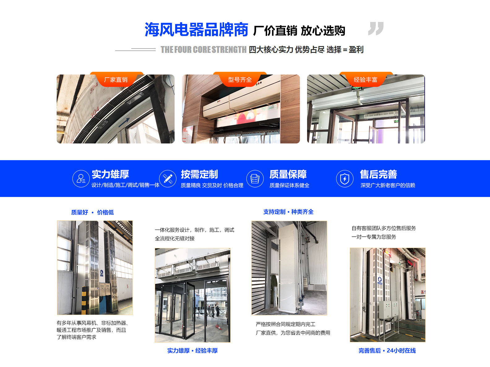 多年從事空調(diào)、風(fēng)幕機、非標(biāo)加熱器產(chǎn)品銷售,具有良好商業(yè)信譽和服務(wù)能力的經(jīng)銷商網(wǎng)絡(luò)做為企業(yè)發(fā)展的源泉。“客戶的需求就是海風(fēng)人的追求”做為海風(fēng)人的服務(wù)理念 ...